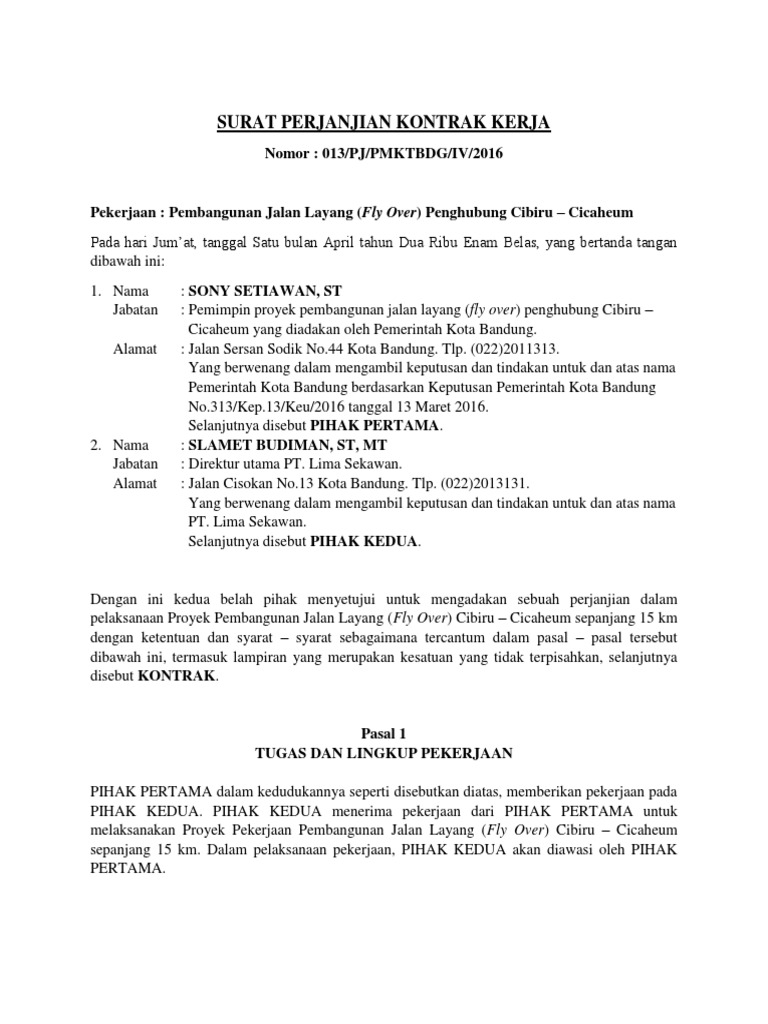 Dalam penyusunan surat kontrak kerja konstruksi perlu diterapkannya aspek hukum, dimana aspek hukum ini yang akan menjadi landasan yang mengikat antara si pemberi proyek dan si penyedia. Maju jaya sejahtera developer and building jl. Kontrak kerjasama merupakan proses awal yang sangat penting untuk memulai bisnis developer karena kontrak kerjasama merupakan komponen yang terbesar dalam satu kesatuan proyek. Jika kita memberi kontrak kerja 2 tahun untuk bekerja di sebuah proyek perusahaan yang masa pekerjaan yang berdasarkan proyek adalah termasuk dalam perjanjian kerja untuk waktu tertentu. Istilah kontrak kerja konstruksi merupakan terjemahan dari construction contract.