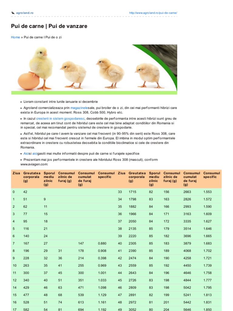 Mortalitatea normală variază între 1 şi 4% din efectiv, pe toată perioada de creştere. Ghid de creştere a puilor de carne este o ediţie adăugită şi revizuită, prima formă a cărţii fiind editată tot în colecţia revistei ferma. Sugestii si idei de retete cu carne de pui. Ghidul cuprinde o serie de informaţii practice, elemente de tehnologie, dar şi aspecte economice şi de rentabilitate privind creşterea puilor de carne. Concentrat pui de carne crestere 32%.