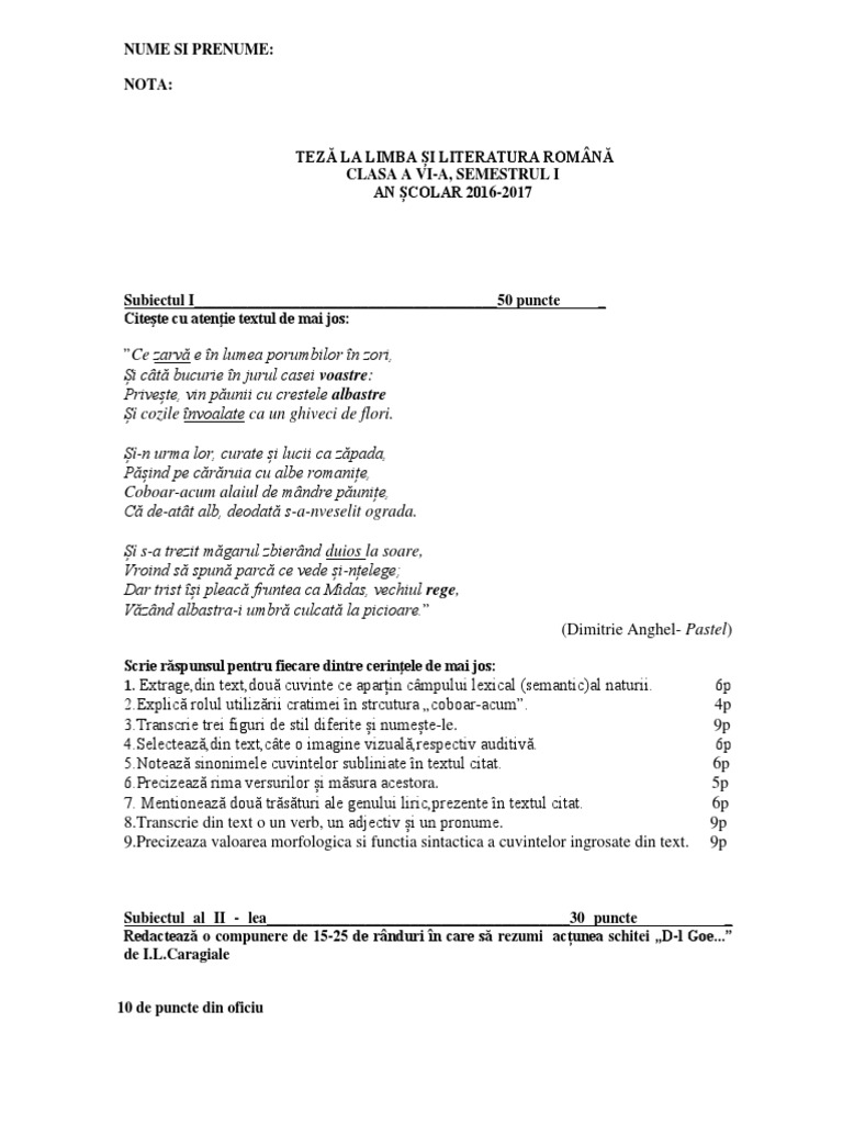 Timp de lucru 50 minute. Se acorda 10 puncte din oficiu. Teza clasa a 5 sem. Se acordă 20 puncte din oficiu. In fiecare an subiectele de teza se schimba,si difer de la un profesor la altul.