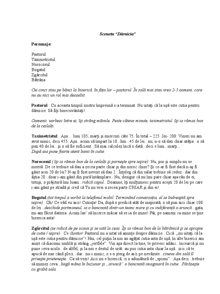 vizitati articolul complet aici : https://www.slideshare.net/lindastefan54/sceneta-in-taraluimoscraciun Exista piese de teatru cu o incarcatura emotionala puternica, insa si scrieri mai usoare si hazli pentru clasele mai mici sau chiar. Asa inteleg ca tot ceea ce simt este normal si ca trebuie discutat. O sceneta cu haz cu 5 personaje.