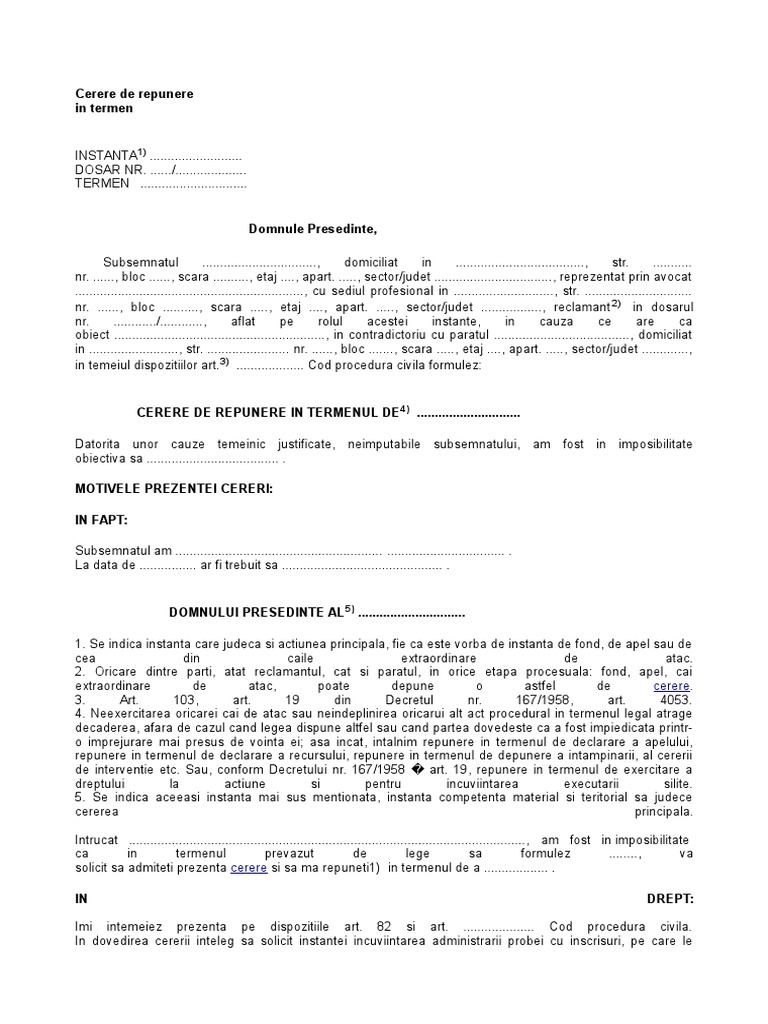 Cererea trebuie sa fie redactata pe un format a4 (fie coala de hartie fie in format electronic), care trebuie sa tina cont de. Cererea de repunere in termenul de exercitare a recursului trebuie formulata in termenul prevazut de art. Tudorel toader, a făcut anunţul în conformitate cu care ar fi pregătit deja un proiect de ordonanţă de urgenţă vizând repunerea în termen a tuturor celor care au fost condamnaţi de către.